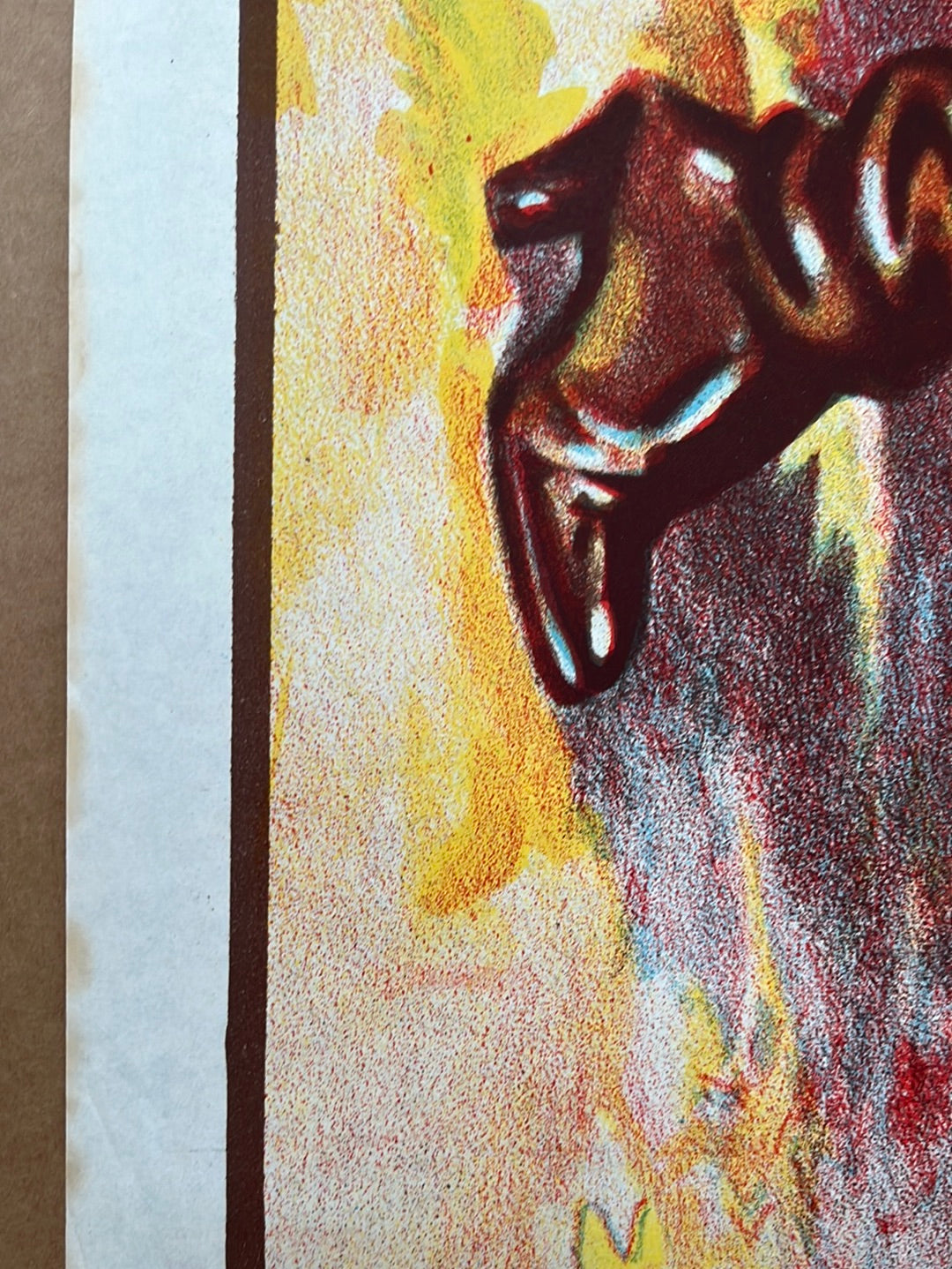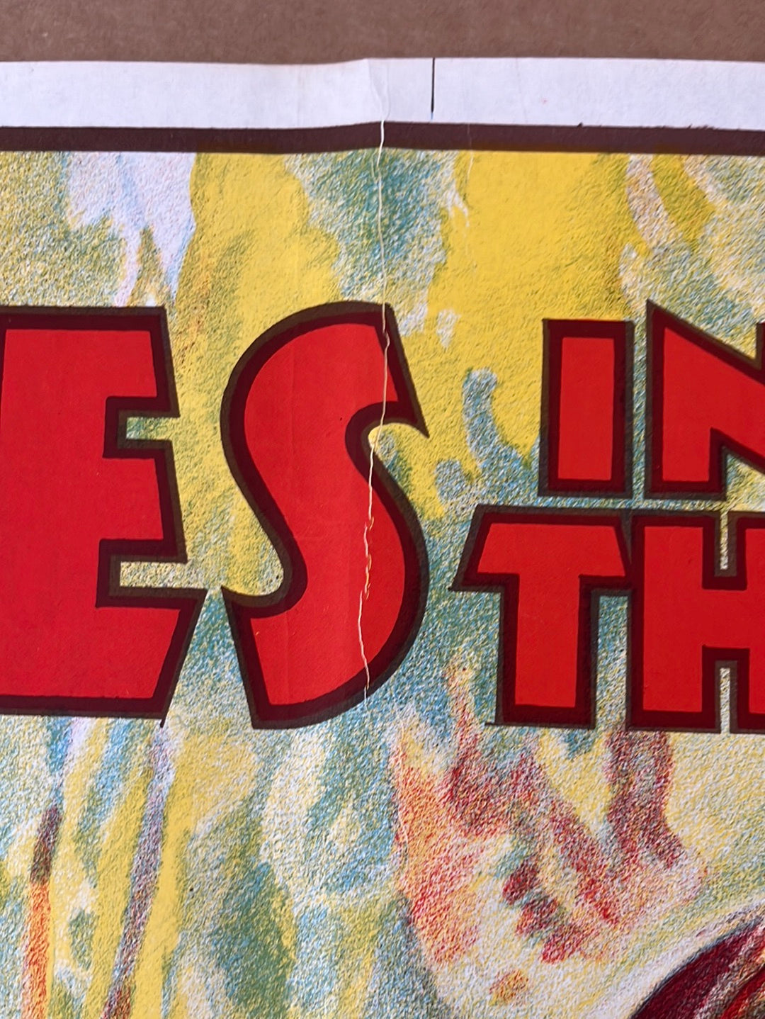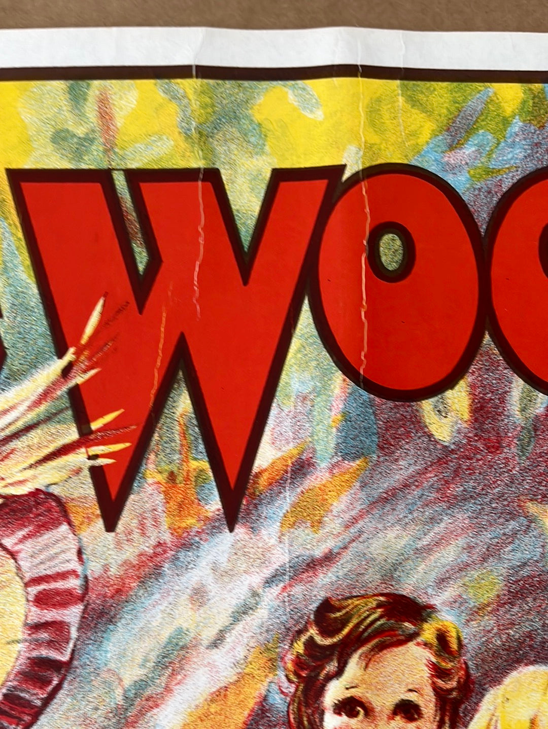 A rare British Quad poster from the 1930s advertising the beloved English pantomime "Babes in the Wood." This theatrical piece measures 30" x 40" (76 x 102 cm) and showcases striking period artwork depicting two children in a woodland setting, with two figures engaged in sword combat. Produced by the renowned Taylors of Wombwell during the late 1930s, this poster represents a piece of British theatrical history from the era of professional Christmas pantomimes. The poster shows authentic vintage wear including edge creasing and markings along the bottom border, consistent with its age and theatrical use. An exceptional find for collectors of vintage stage memorabilia and British entertainment history.