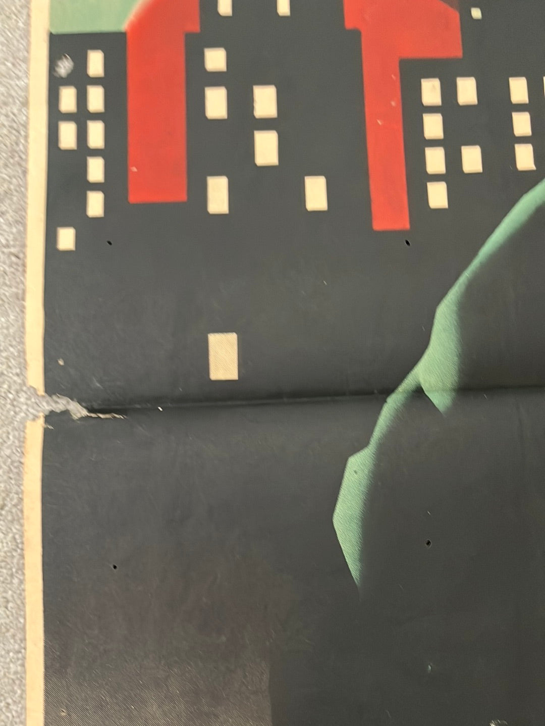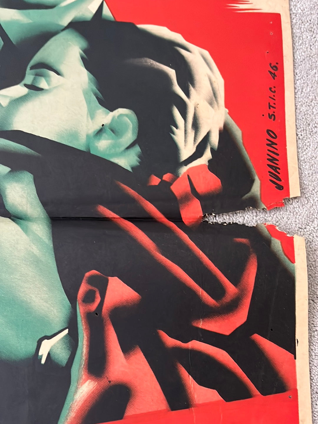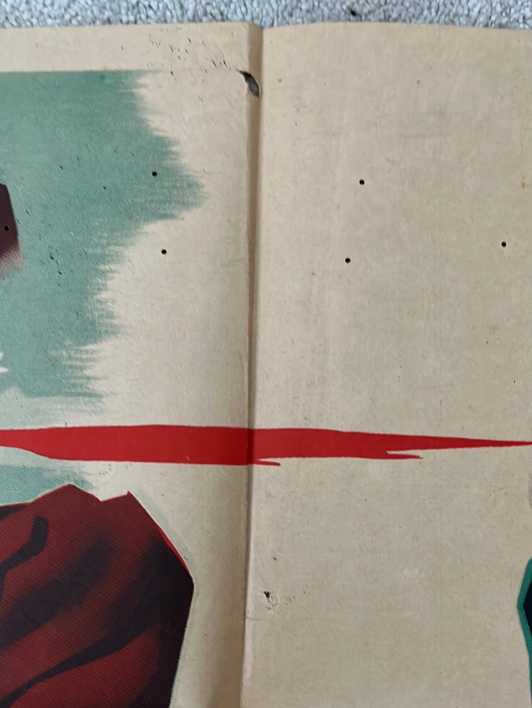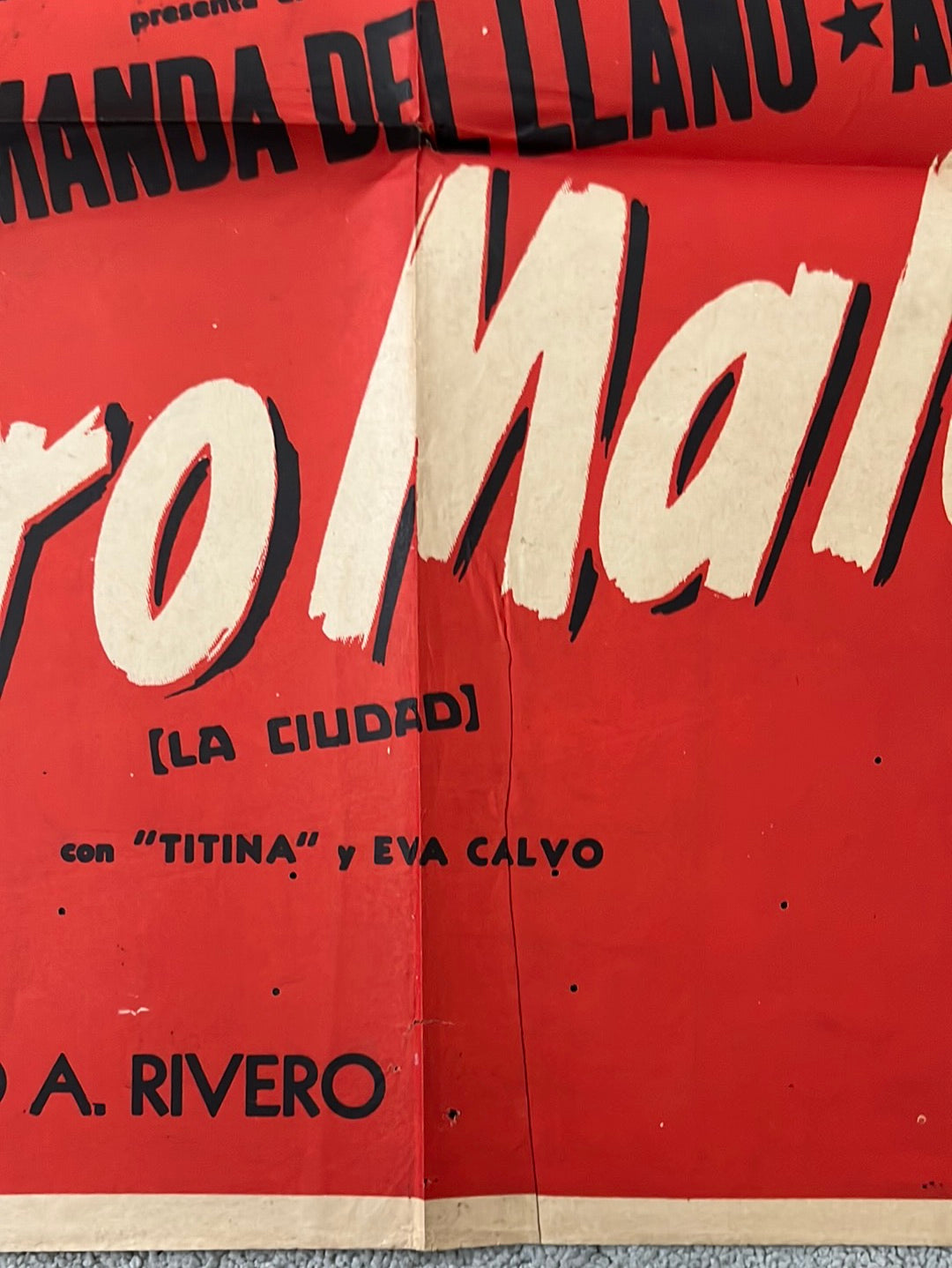 Original Mexican theatrical poster for Dinero Maldito (Cursed Money), a 1949 crime thriller melodrama directed by Fernando A. Rivero. This folded cinema poster measures 26 3/4" x 37" (68 x 94 cm) and features artwork by Juanino Renau Berenguer. The cast includes Carmen Montejo, Amanda Del Llano, Armando Silvestre, Titina Romay, and Eva Calvo. The poster exhibits authentic vintage wear including heavy edge creasing, tears along the centre fold, and pin holes from theatrical display. A rare piece of Mexican cinema history from the golden age of Mexican film.