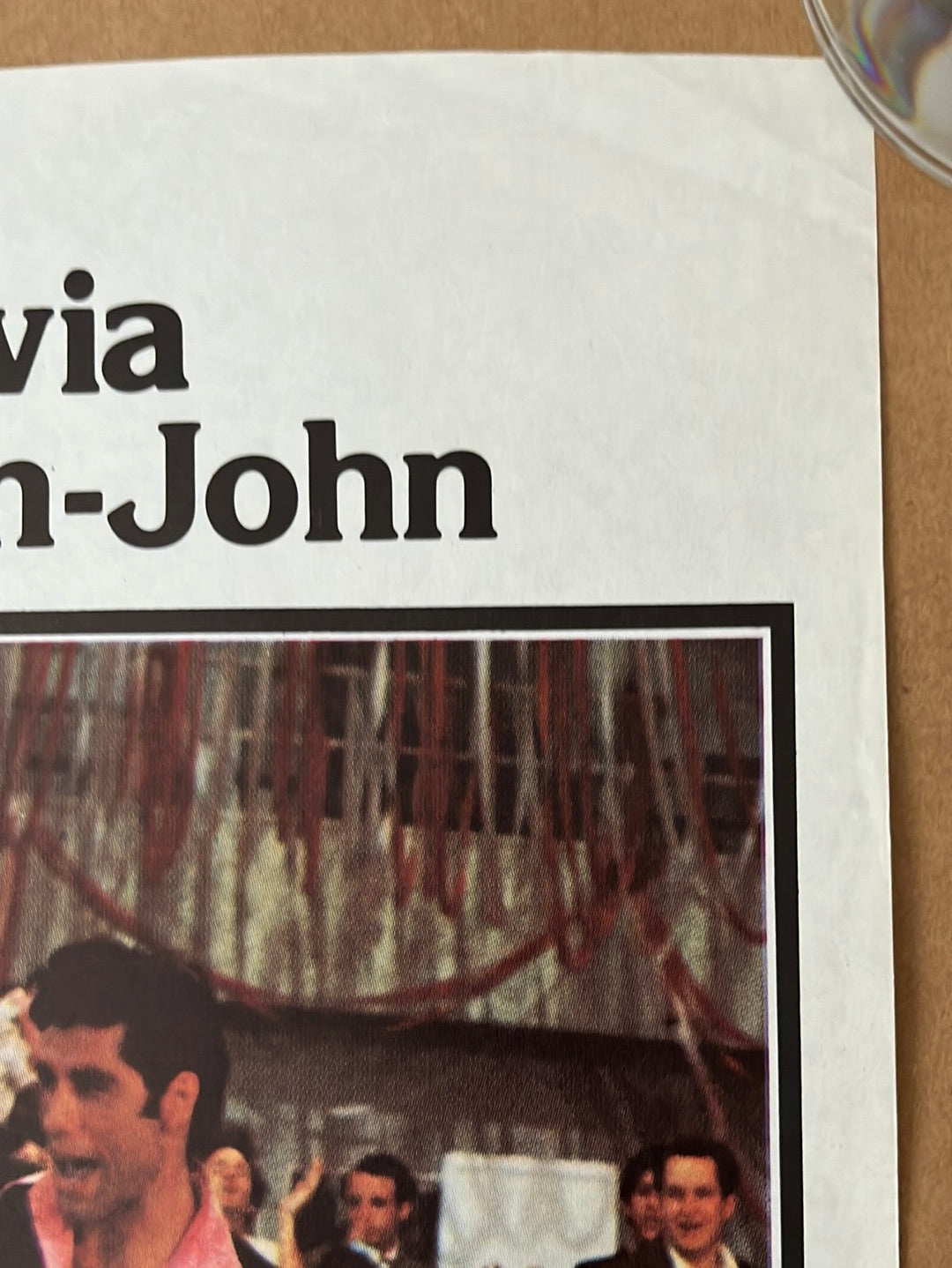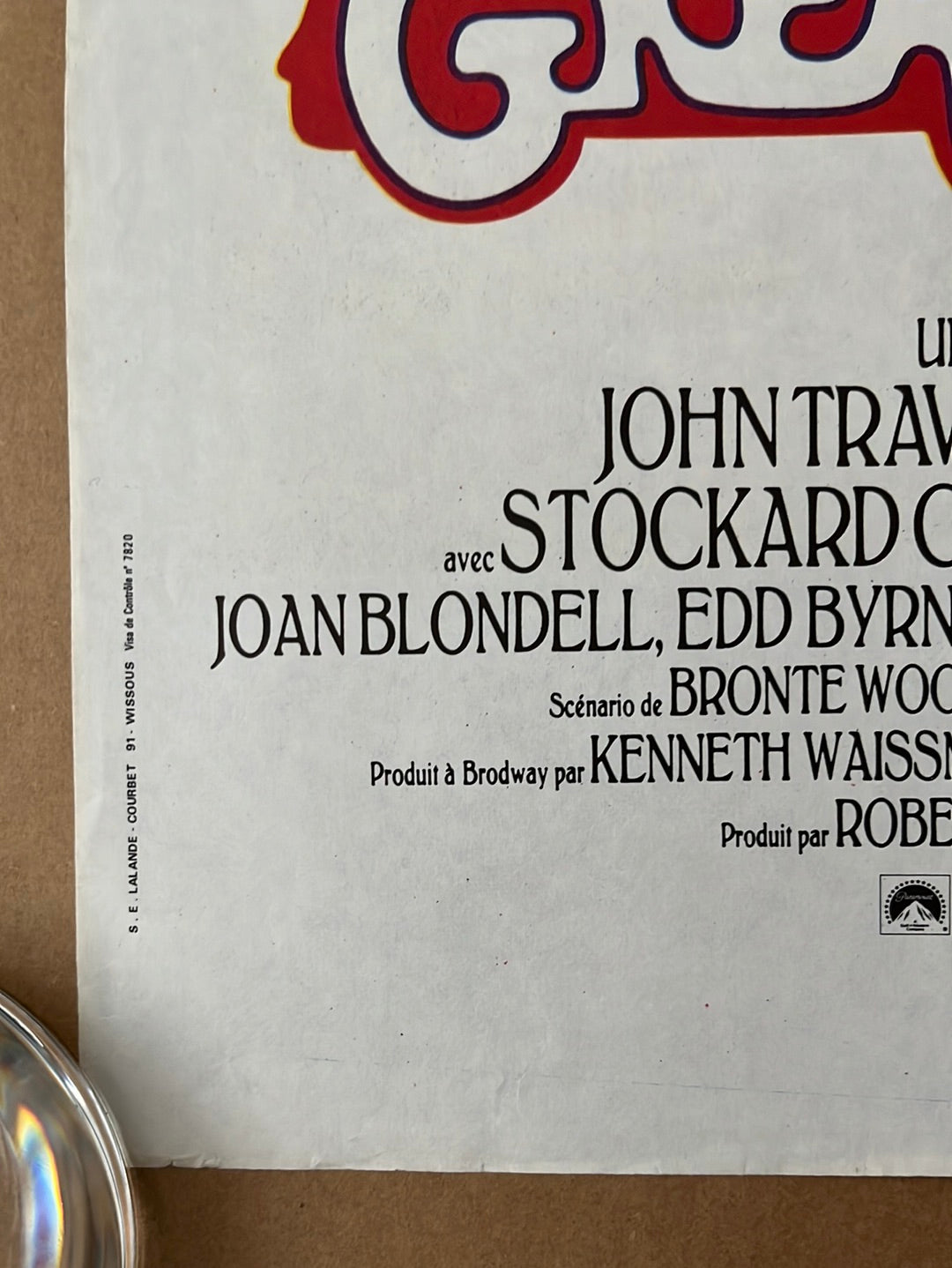 Original vintage French "petite" poster from Grease (1978), measuring 15¾" × 23½" (40 × 60 cm) in folded format. Randal Kleiser's rock 'n' roll musical adaptation of the hit Broadway show by Jim Jacobs and Warren Casey features John Travolta as Danny Zuko and Olivia Newton-John as Sandy, with additional songs by The Bee Gees. The ensemble cast includes Stockard Channing as Rizzo, Jeff Conaway as Kenickie, Didi Conn as Frenchy, Susan Buckner as Patty Simcox, Eddie Deezen as Eugene, and Annette Charles as Cha Cha DiGregorio, alongside special guest appearances by Eve Arden, Frankie Avalon, Joan Blondell, Sid Caesar, and Sha-Na-Na. This iconic high-school romance became a cultural phenomenon and enduring musical classic. The vintage poster displays minor edge and fold wear with some creasing from theatrical exhibition and age. A collectible French-market artefact from one of cinema's most beloved musicals. Condition details visible in accompanying photographs.