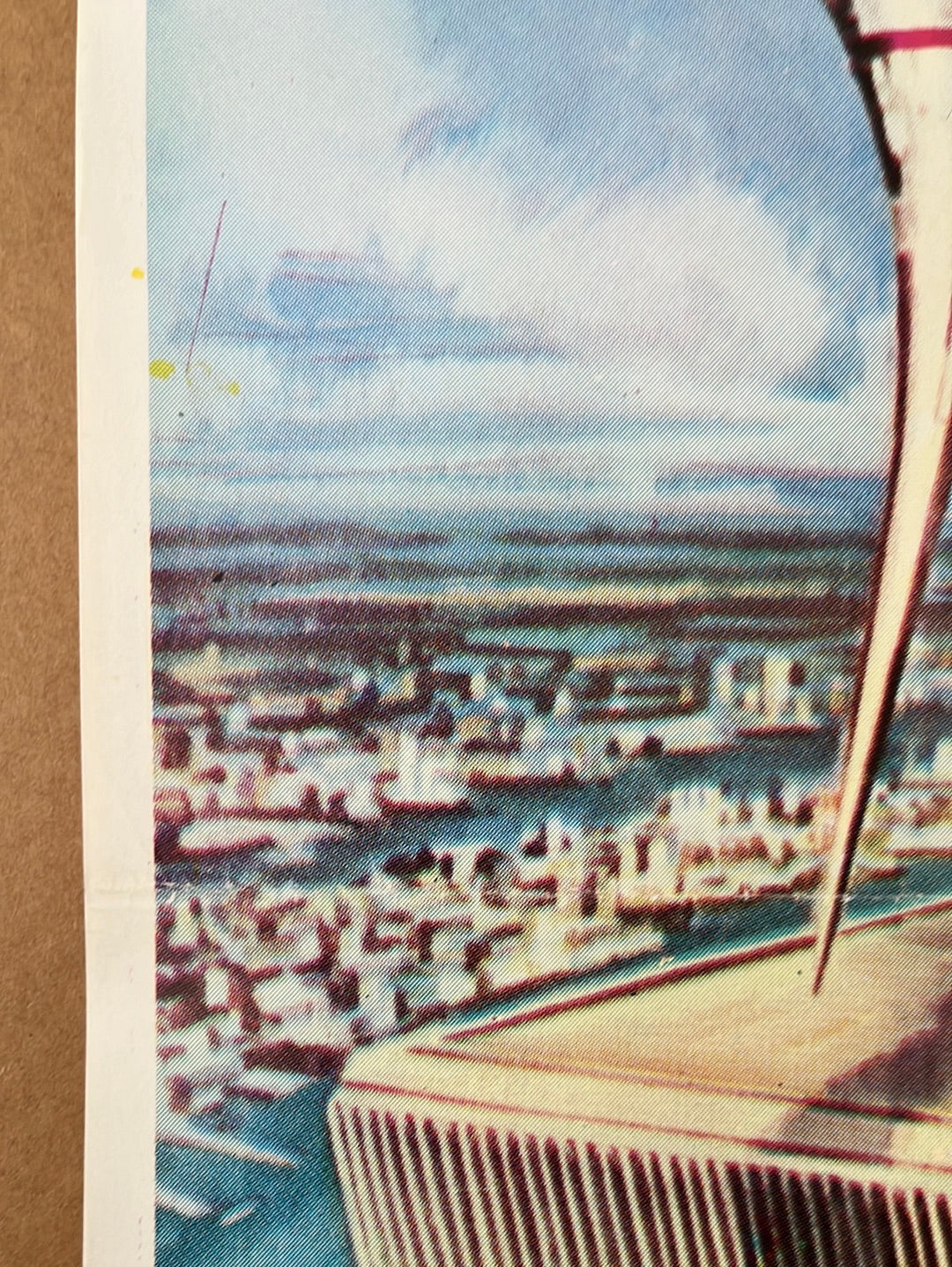 Yugoslavian theatrical poster for King Kong (1976), John Guillermin's epic reimagining of the classic monster tale produced by Dino De Laurentiis. This folded vintage piece measures 18½" × 26½" (47 × 67 cm) and stars Jeff Bridges, Charles Grodin, and Jessica Lange (in her film debut) in a romantic adventure across a fantastical landscape. Artwork by acclaimed illustrator John Berkey captures the film's grand scale. Originally folded with minor edge wear and scattered age-related yellowing from theatrical distribution in Eastern Europe. Condition details visible in accompanying photographs.