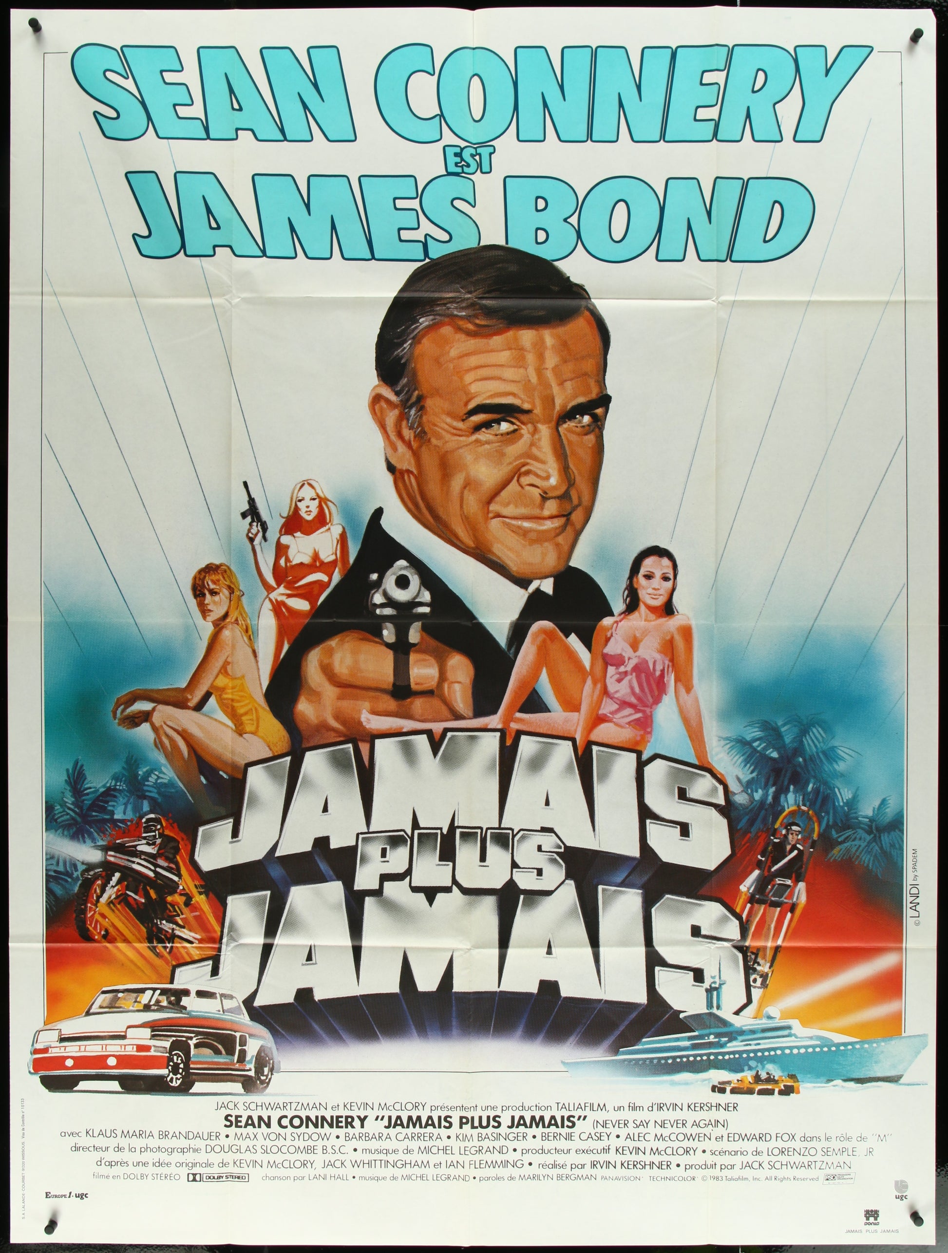 This is an authentic, folded French one-panel movie poster ("Grande" size) measuring 47" x 62 3/4" (119 x 159 cm) for Never Say Never Again, the 1983 action thriller directed by Irvin Kershner and starring Sean Connery, Klaus Maria Brandauer and Max Von Sydow. Designed by artist Michel Landi, the poster exhibits some edge and fold wear.