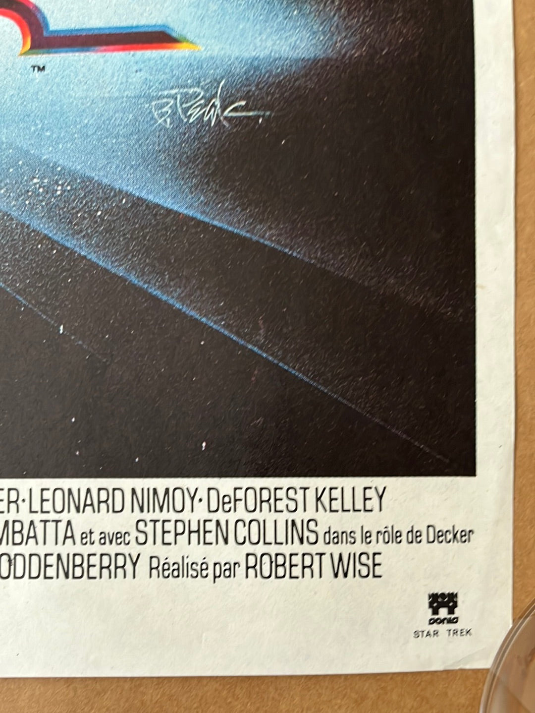 Original vintage French "petite" poster from Star Trek: The Motion Picture (1979), measuring 15¼" × 20¾" (39 × 53 cm) in folded format. This French release poster dates from 1980. Robert Wise's sci-fi epic reunites the original television cast—William Shatner as Captain Kirk, Leonard Nimoy as Spock, DeForest Kelley as Dr. McCoy, James Doohan as Scotty, George Takei as Sulu, Walter Koenig as Chekov, and Nichelle Nichols as Uhura—alongside Majel Barrett, Persis Khambatta, Stephen Collins, and Grace Lee Whitney. Based on a story by Alan Dean Foster with screenplay by Harold Livingston, the film launched the franchise's cinematic legacy following the original series' 1969 cancellation. Artwork by Bob Peak. The vintage poster exhibits minor edge and fold wear with pin holes from theatrical display. A collectible French-market artefact marking the beginning of Star Trek's enduring film and television empire. Condition details visible in accompanying photographs.