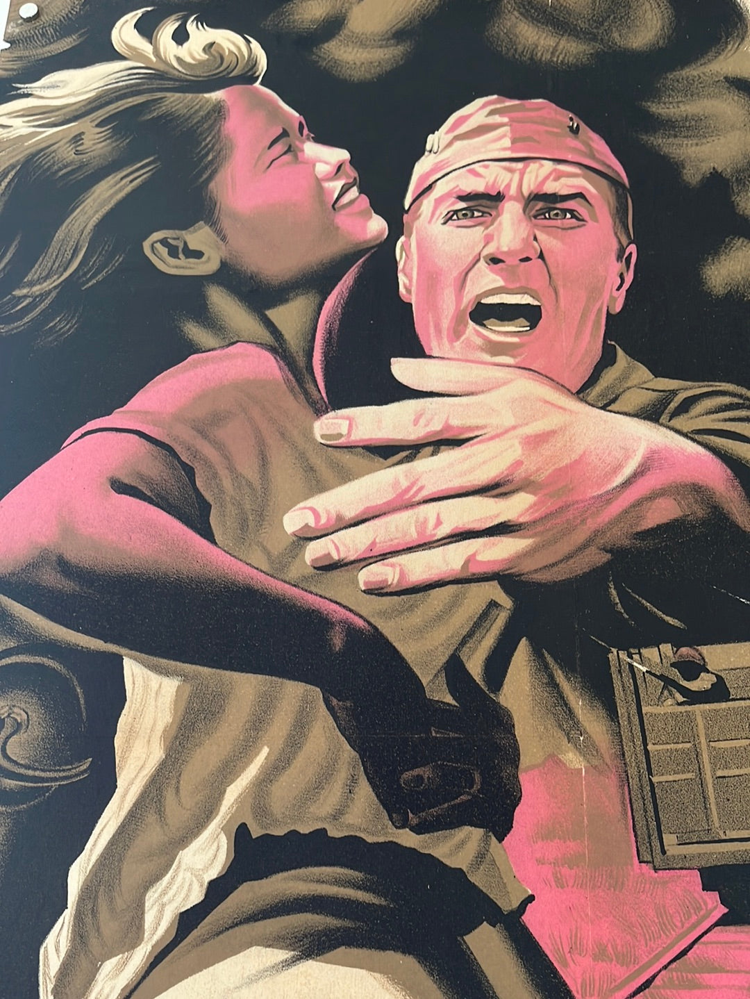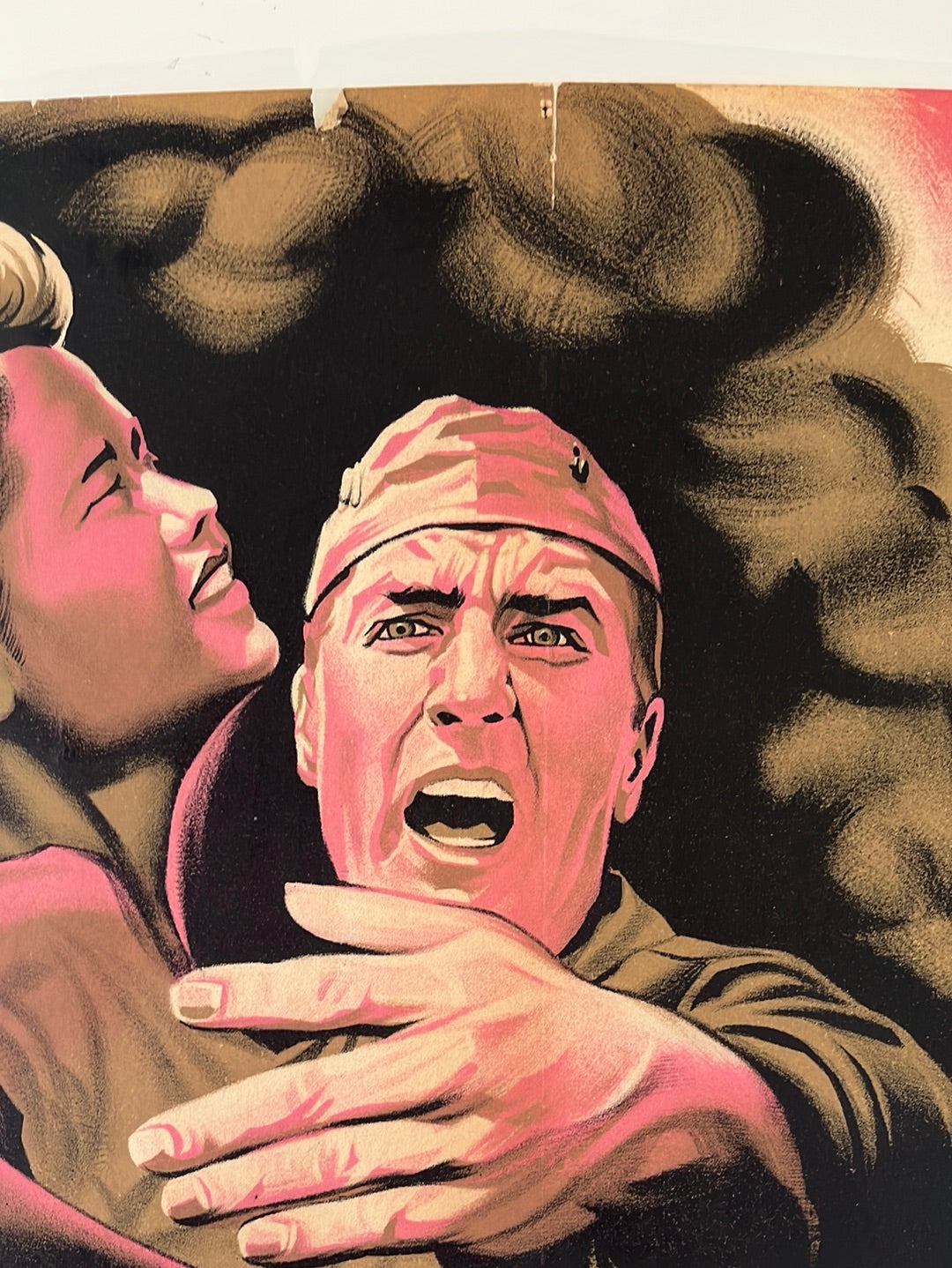 A genuine vintage French theatrical poster for The Steel Claw (1961), George Montgomery's WWII action thriller set in the Pacific theatre. This folded affiche measures 22¼" × 31½" (57 × 80 cm) and showcases artwork by artist Koutachy promoting the film's gripping narrative of wartime combat and survival. The ensemble cast includes Montgomery, Charito Luna, Mario Barri, Carmen Austin, and Ben Perez. Age-appropriate condition with edge wear, small tears, and minor loss; imagery remains legible. A notable artefact of 1960s French cinema distribution and mid-century war film marketing.