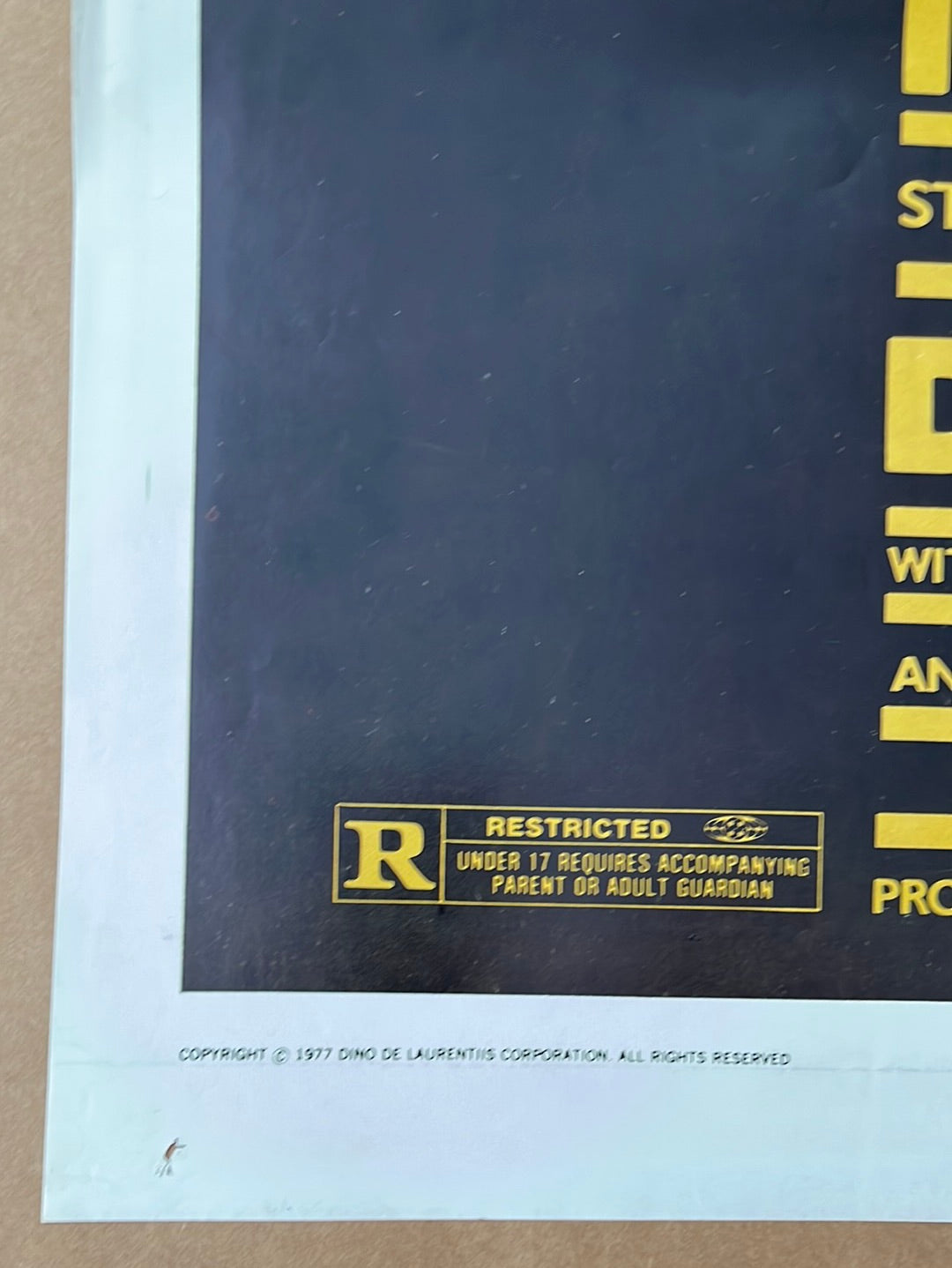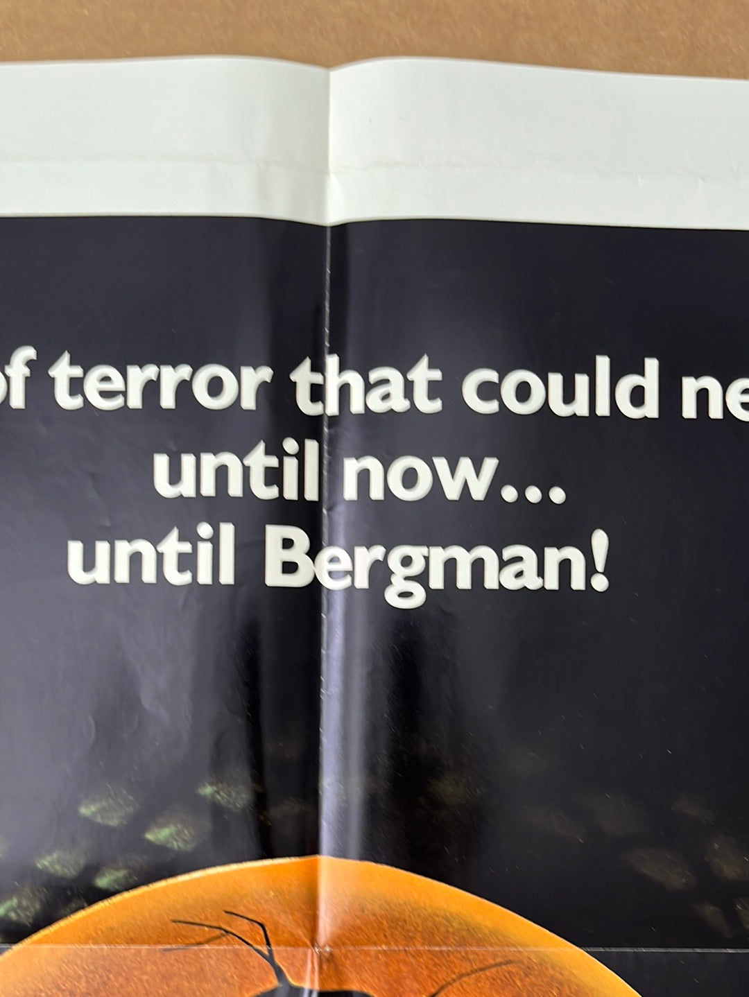 Original 1978 US One Sheet theatrical poster for The Serpent's Egg (Das Schlangenei), Ingmar Bergman's haunting psychological thriller set in post-war Berlin. This folded One Sheet (27" x 41" / 69 x 104 cm) features Liv Ullmann and David Carradine alongside Gert Froebe, Heinz Bennent, and James Whitmore in Bergman's exploration of political corruption, family trauma, and moral decay during a turbulent historical moment. The film's dark atmosphere and complex character dynamics reflect the director's mastery of psychological cinema. The poster displays authentic wear from theatrical circulation and storage—a folded top border, edge and fold creasing, pin holes, and minor markings—testament to its genuine period provenance. An essential collectible for admirers of Bergman's later work and European art cinema of the 1970s.