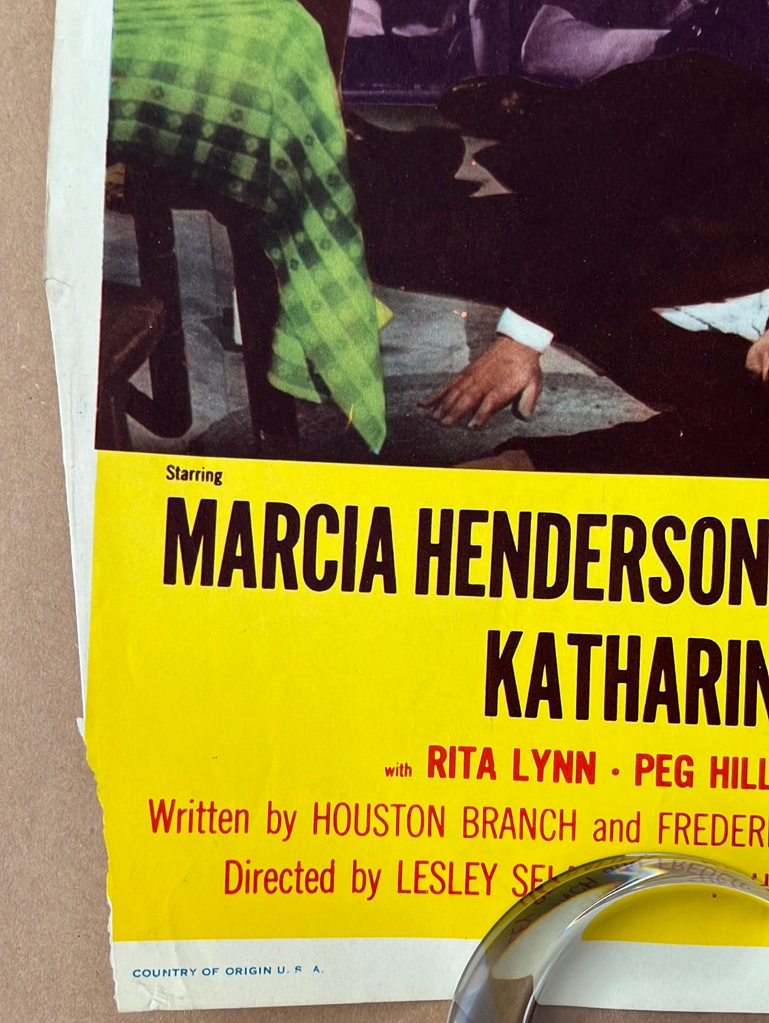 An original theatrical insert from *The Wayward Girl* (1957), a crime thriller directed by Lesley Selander. This folded poster measures 14" × 36" (36 × 91 cm) and was shot in Naturama, featuring a dark narrative of exploitation and survival. Written by Houston Branch and Frederic Louis Fox, the film follows a young woman trapped between a predatory stepmother and her criminal associates, leading to imprisonment and a dangerous parole arrangement. The cast includes Marcia Henderson, Peter Walker, Katharine Barrett, Whit Bissell, Rita Lynn, Peg Hillias, Tracey Roberts, Ray Teal, and Barbara Eden in an early role. Condition shows a section of border torn away at bottom left, minor edge and fold wear, pin holes, and markings. Consult photos for full condition evaluation.
