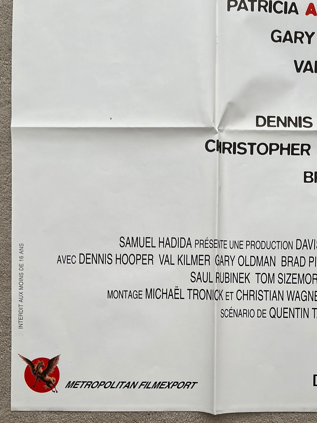 Original French one-panel theatrical poster (Grande format) for True Romance, Tony Scott's 1993 romantic action crime thriller written by Quentin Tarantino. This folded cinema poster measures 45 1/4" x 61 1/4" (115 x 156 cm) and showcases the film's stellar ensemble cast including Christian Slater, Patricia Arquette, Dennis Hopper, Val Kilmer, Gary Oldman, Brad Pitt, Christopher Walken, Samuel L. Jackson, James Gandolfini, and others. The poster displays minor edge and fold wear consistent with theatrical use. A striking French distribution piece capturing the iconic imagery and star power of this celebrated 1990s crime romance.