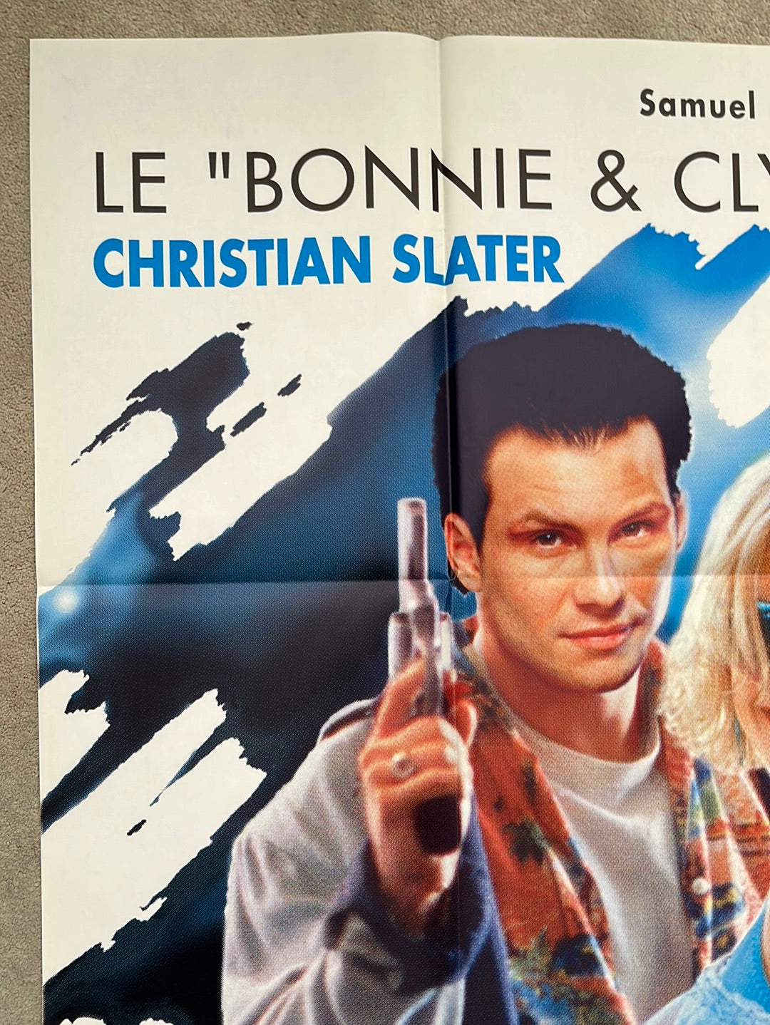 A genuine vintage French Grande poster from the 1993 theatrical release of True Romance, directed by Tony Scott and written by Quentin Tarantino. This one-panel format measures 46 3/4" x 62 1/2" (119 x 159 cm) and bears the hallmarks of original cinema distribution—blue ink printing visible around the top left fold area, with expected edge and fold creasing from decades of handling. Features the iconic ensemble cast including Slater, Arquette, Hopper, Kilmer, Oldman, Pitt, Walken, and Jackson. Inspect photos for full condition assessment.