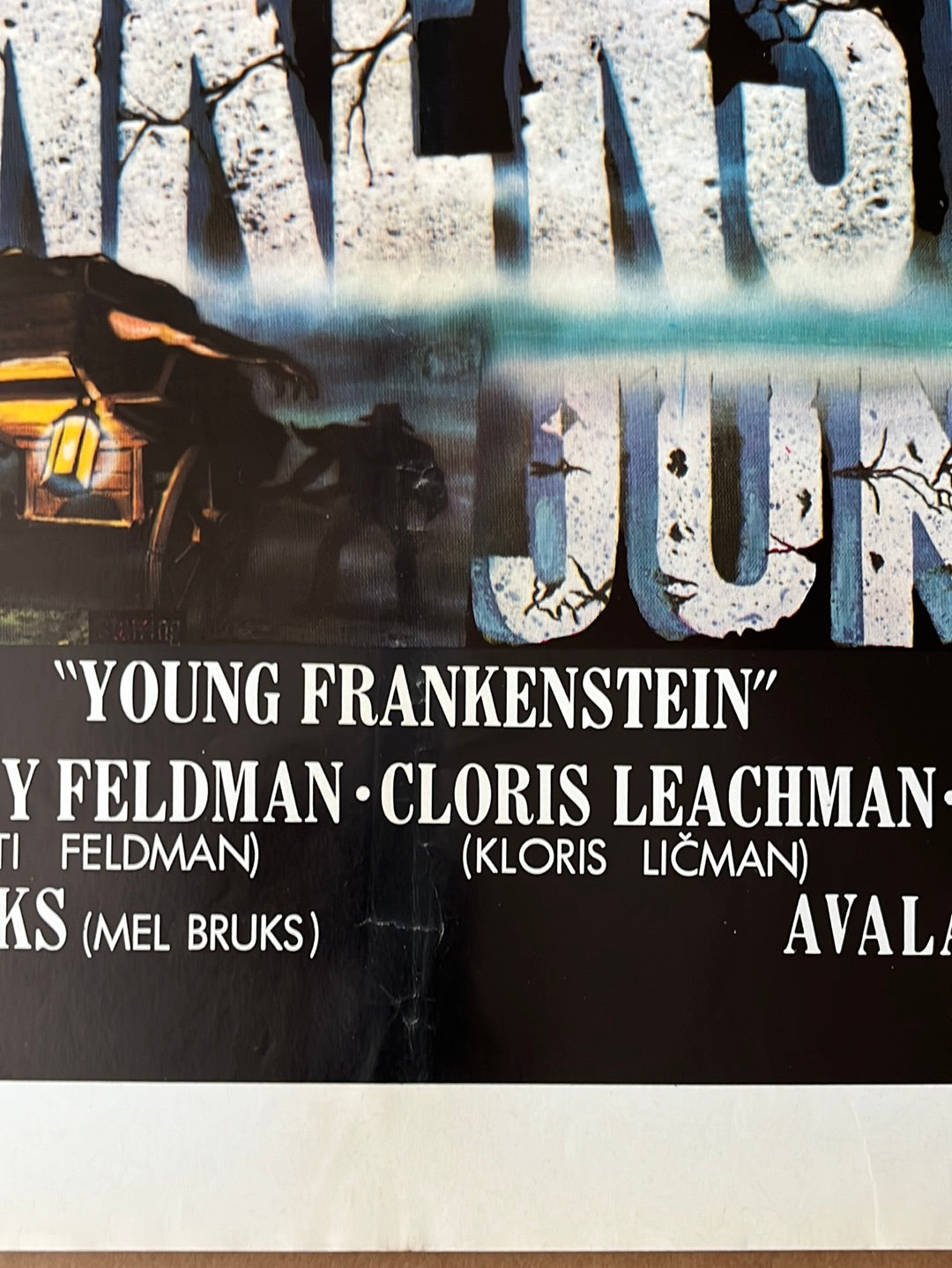 An original vintage Yugoslavian theatrical poster for Mel Brooks's beloved 1974 comedy classic *Young Frankenstein*. This folded cinema poster measures 19½" × 27½" (50 × 70 cm) and features artwork by John Alvin. The film stars Gene Wilder as Dr. Frederick Frankenstein, alongside Peter Boyle, Marty Feldman, Cloris Leachman, Teri Garr, Kenneth Mars, Madeline Kahn, and Gene Hackman in this celebrated monster-movie parody. The poster shows authentic edge and fold wear from its theatrical history. Review condition details in the accompanying photographs.
