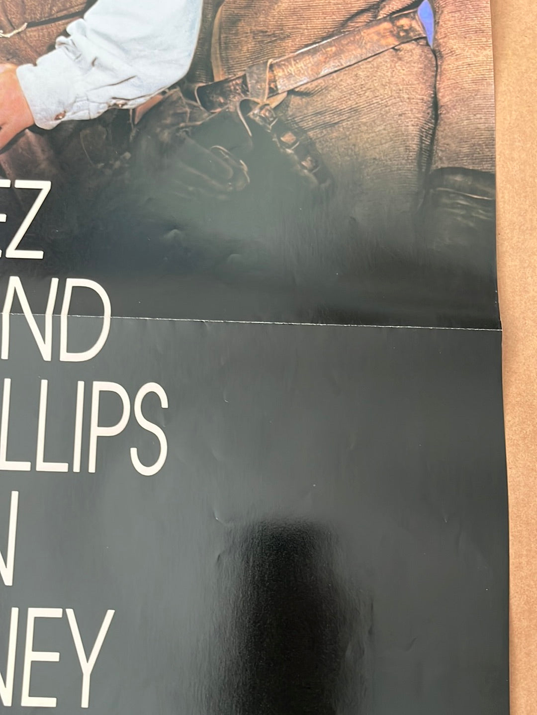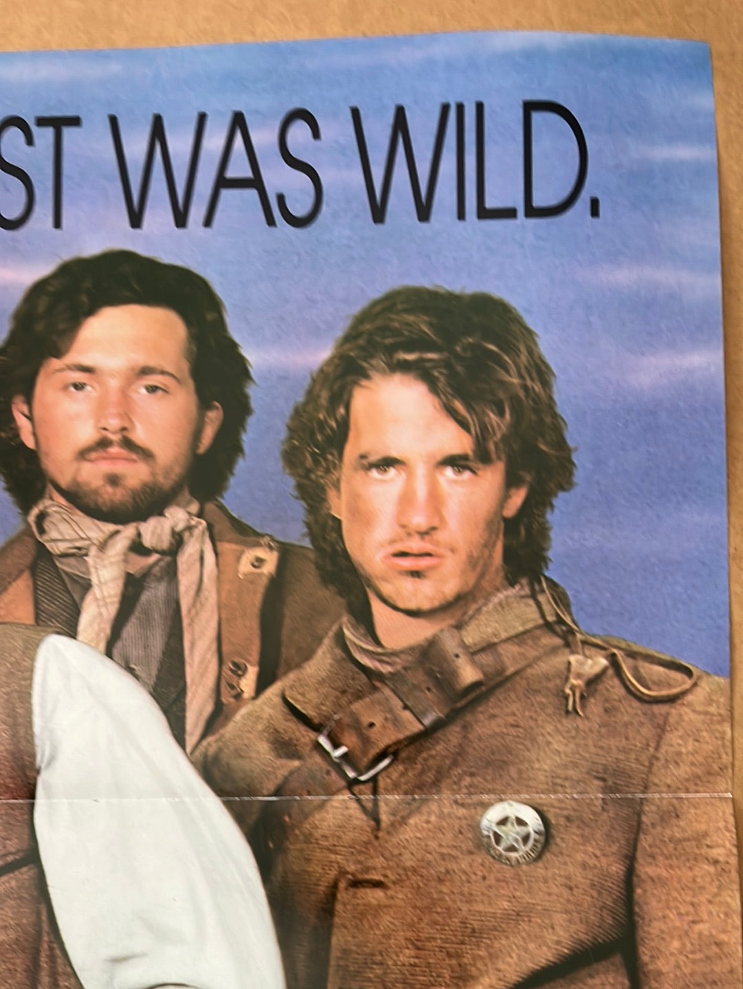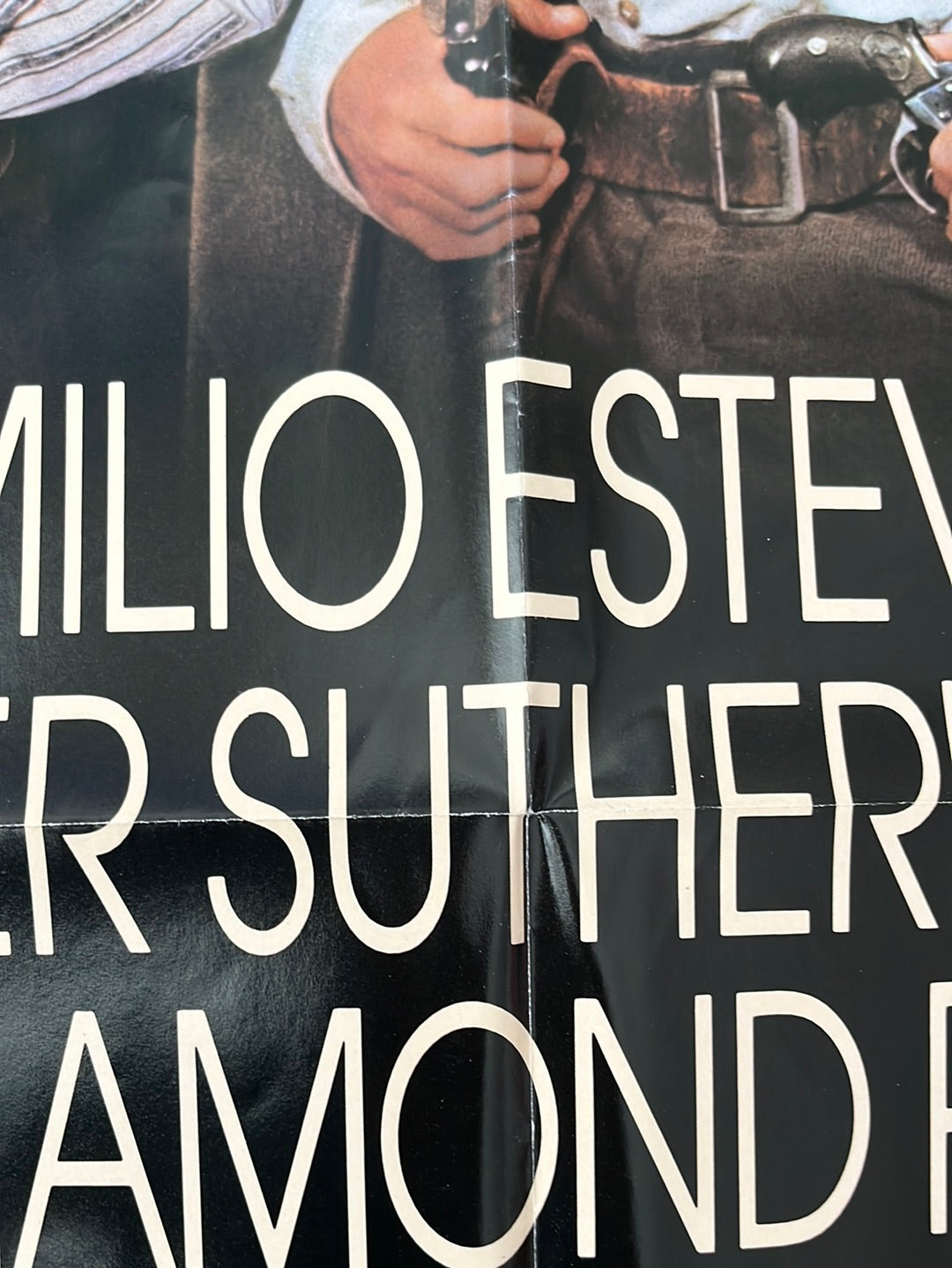 This original 1988 theatrical one-sheet poster for Young Guns measures 26¾" × 39¾" (68 × 101 cm) and features the Christopher Cain western starring Emilio Estevez as Billy the Kid, alongside Kiefer Sutherland, Lou Diamond Phillips, and Charlie Sheen. The folded vintage piece shows authentic wear consistent with age, including edge and fold creasing plus minor perforations along the bottom fold line. Examine the detailed photographs for a complete condition assessment before purchase.